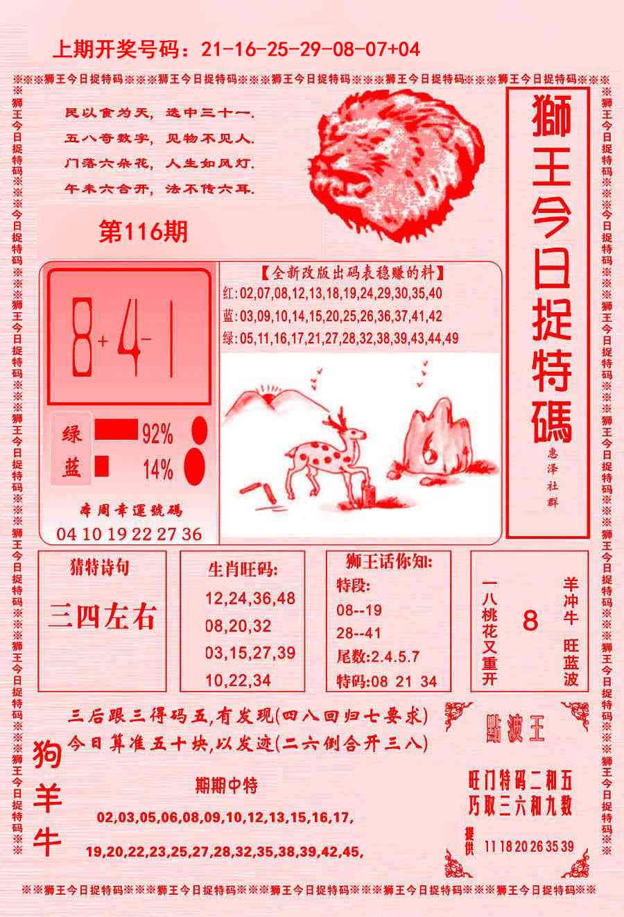 116期: 澳门六合宝典彩圖信封【狮王平特】每期自动更新